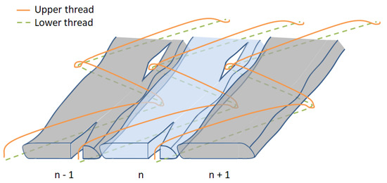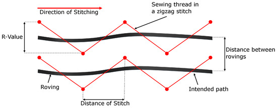 Some of the intrinsic parameters of the TFP process are examined, and they are depicted in Figure 4. There, two rovings are presented side-by-side where the thick black solid line describes their intended path. The thin red solid lines correspond to the sewing thread in a zig-zag stitch, and symmetric stitching is observable—refer to Figure 2b for the antisymmetric stitching. The red dots represent the stitching points, and the horizontal and vertical distances between two sequential points are important parameters for the TFP technology. By the R-value (vertical distance), one controls the thickness, smoothness of the thickness variation, etc., whereas, by the distance of stitch (horizontal distance), one can define the waviness (which is a correlation between the R-value, the distance of the stitch, and the width of the roving). From the distance between rovings, the thickness is derived (see ref. [3] for further details).
