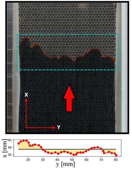 The flow front required for the permeability determination was measured at discrete time steps by image series, in which the front determination is performed by manual recognition in each image. The flow front represents the averaged progress as a straight line [12] (or the average volume of the resin inside the chamber of a particular time), as shown in Figure 5: the red line in both figures represents the actual flow front while the straight black line at the bottom figure represents the averaged value.