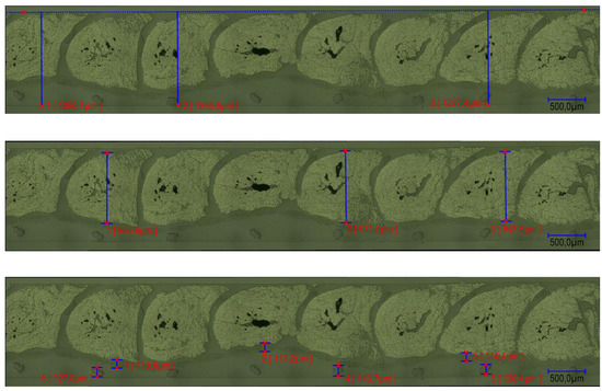 Examples of measurements of distance in specific regions at several places of a microsection: overall (top), roving (middle), and base-material and thread thicknesses (bottom).