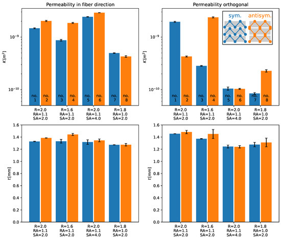 One possible reason for the slightly larger permeability in the case of antisymmetric stitching pattern, besides the larger cavity thickness, is that, essentially, the infusion of TFP preforms is dominated by the flow in-between the sewing thread layer (bottom) and the flow in the sewing top layer part of the preform (top). The antisymmetric pattern creates connections between the yarns, which are channels where the resin can flow easier. In the symmetric pattern, the channels are not connected to each other. These channels are fed and retrofed with resin by both top and bottom flows. This interaction accelerates the infusion process and might also be responsible for the low difference between the permeabilities in the fiber compared to the perpendicular to the fiber direction. Furthermore, as observable in Figure 6 and Figure 7, the sewing thread induces void regions throughout the preform, and, normally, these regions were not taken into account in the determination.