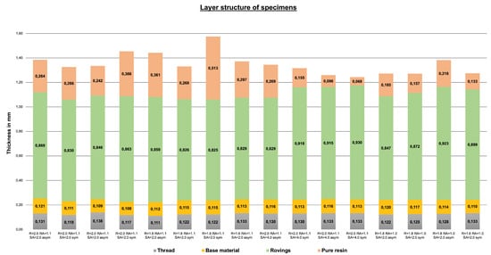 As aforementioned, a layered structure is observed in the TFP specimens. Through the microsection analyses, the thickness distribution inside the specimens could be observed and measured. Figure 10 depicts the thicknesses of the sewing thread layer, base material, roving layer, and sewing top layer for each specimen. It is noticeable that the thickness of the sewing thread layer, base material, and roving layer vary only a little. The sewing thread layer and the base-material thicknesses vary between 0.111 and 0.133 mm and 0.108 and 0.121 mm, respectively. No connection between the overall specimen thickness with the small variations of these two thicknesses was found, indicating that these values are not influenced by the cavity size. Another important piece of information obtained by the microsection analyses is that the roving thickness also has little variation among the samples. Similarly to the sewing thread layer and the base-material thicknesses, no correspondence between the specimen thickness and the roving region was found. The only thickness that varies with the final cavity height is the thickness of the resin layer at the top of the specimen. The indication of these results is that the local fiber density remains high even for big cavity sizes. Furthermore, local is not strongly dependent on average as TFP preforms are compressed on their own. For the same reason, compression of the preforms through a small cavity is also limited since the sewing thread reduces the free movement of the fibers of the rovings. The implication, qualitatively, is that the local (the content in the roving region) has top and bottom limits. Further evaluation must be performed to obtain such limits and the influence of the stitching parameters on them.