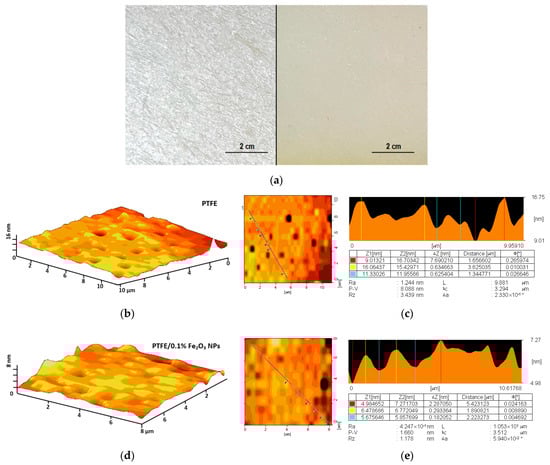 Example of applying a PTFE-based coating to a damaged surface of a fluoroplast before (left) and after (right) coating (a); AFM images of composite material surface: (b) 3D reconstruction of PTFE without NPs; (c) result of analysis of PTFE selected area (shown as a diagonal line in the figure) without NPs surface; (d) 3D reconstruction of PTFE/0.1% Fe2O3 NPs; (e) result of analysis of PTFE/0.1% Fe2O3 NPs surface. The results of the analysis in panels (c) and (e) are presented in the form of profiles and a table with data on the depth of the asperities in the sample.