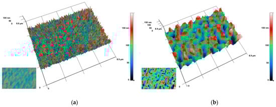 After obtaining the PTFE/Fe2O3 NP composite, its surface was characterized by the AFM method (Figure 2), and the distribution of NPs in the thickness of the polymer matrix was also estimated (Figure 3). On the surface of the PTFE without NPs, noticeable microdamages or defects (cracks, scales, etc.) were not found (Figure 2a,b). The surface of the PTFE/Fe2O3 NP composite was also smooth and free from microdamages (Figure 2c,d). Using the MIM method, it was found that the nanoparticles formed aggregates or clusters in the thickness of the polymer matrix of the PTFE/Fe2O3 NP composite (Figure 3b–d), which was consistent with data obtained in the earlier studies of the research team on polymer composites with nanoparticles of oxides of other metals [].