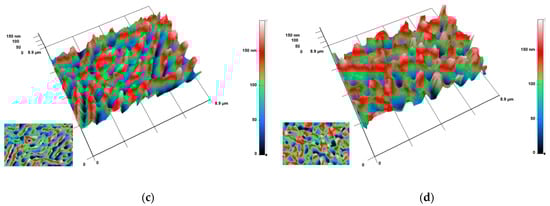 The results of the analysis of the obtained materials by MIM method: (a) PTFE without the addition of nanoparticles; (b) PTFE with the addition of 0.001% Fe2O3 nanoparticles; (c) PTFE with the addition of 0.01% Fe2O3 nanoparticles; (d) PTFE with the addition of 0.1% Fe2O3 nanoparticles. The images are presented as 3D reconstructions, where the abscissa and ordinate axes correspond to the real distance in μm. The Oz axis displays the phase difference in nm (the larger the phase difference, the higher the value on the Oz axis). Coloring is a pseudo-color. The initial data on the spatial distribution of the phase difference in the analyzed sample, used to construct 3D reconstructions, are shown in the lower left corners of each panel.