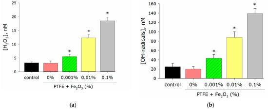 Effect of PTFE/Fe2O3 NPs on generation of free radicals: (a) hydrogen peroxide (2 h, 40 °C); (b) OH radials (2 h, 80 °C). Data are presented as means ± standard errors. *—p < 0.05 vs. control, Mann–Whitney test (n = 3).