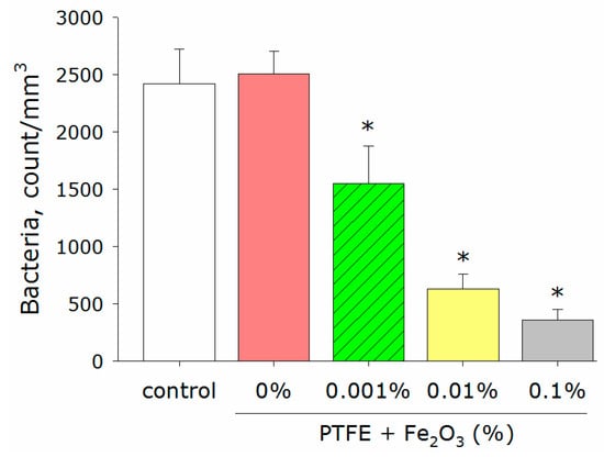 Examination of antibacterial activity of composite PTFE/Fe2O3 NPs against E. coli. Data are presented as means ± standard errors. *—p < 0.05 vs. control, Mann–Whitney test (n = 3).
