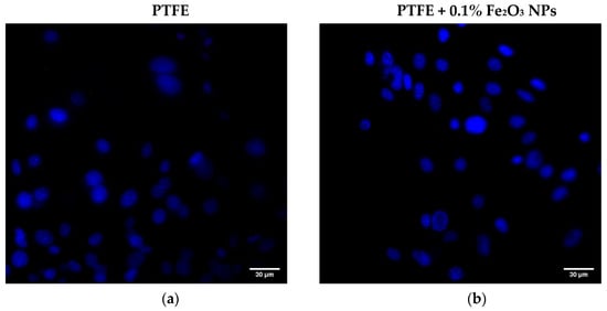The study was performed on a primary culture of murine fibroblasts (BALB/c males weighing 22–25 g), which were isolated and cultivated according to a standard protocol []. All experiments with laboratory animals were carried out in accordance with the regulatory legal act of the Ministry of Health of the Russian Federation №199-n “On approval of the rules of good laboratory practice” and the international legal norms specified in the European Convention ETS №123 “On the protection of vertebrate animals used for experiments or for other scientific purposes”. Round coverslips were coated by PTFE with the addition of 0.1% Fe2O3 nanoparticles or PTFE without nanoparticles and were dried for 24 h in a fume hood. Cells were seeded on prepared slides and uncoated slides (control) and cultured in DMED/F12 medium supplemented with 10% FBS, 2 mM L-glutamine, and antibiotics (Sigma Aldrich, Burlington, MA, USA) for 72 h at 37 °C and 5% CO2. After incubation, cells were stained with fluorescent dyes Hoechst33342 and PI (Sigma Aldrich, Burlington, MA, USA) and were analyzed using a DMI6000 fluorescent microscope (Leica, Wetzlar, Germany) [,,].