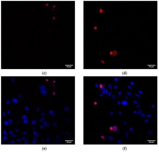 At the last stage of this research, the effect of the obtained coatings on the viability of animal cells was studied using murine fibroblasts as an example. As criteria for evaluation, the proportion of dead cells and the size of the nucleus were chosen. The proportion of dead cells was defined as the ratio of the number of dead cells whose nuclei were stained with PI (Figure 7c,d) to the total number of cells whose nuclei were stained with Hoechst33342 only (Figure 7a,b).