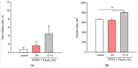Cytotoxicity of composite PTFE/Fe2O3 NPs: (a) percentage of non-viable cells, where the amount of all analyzed cells was taken as 100%; (b) average nuclei size of cells. Data are presented as means ± standard errors. *—p < 0.05, Mann–Whitney test (n = 3).