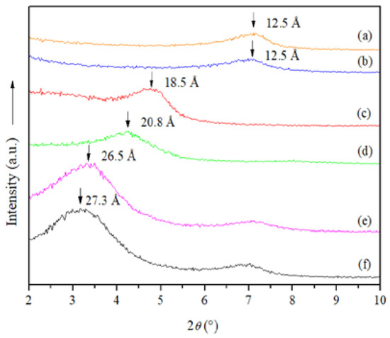 An X-Pert Pro diffractometer (Almelo, Netherlands) operating at 40 kV and 40 mÅ, with Cu Kα radiation (λ = 1.5406 Å), was used to obtain the XRD patterns of the Mts. Samples of finely ground Mt powder were placed in horizontal glass holders. XRD patterns were recorded at a scanning speed of 0.5°/min in an angular range of 2θ = 2° to 10°. The distances between the planes of the crystals d (Å) were then calculated from the diffraction angles (°) measured from the XRD patterns, following Bragg’s law [13]: