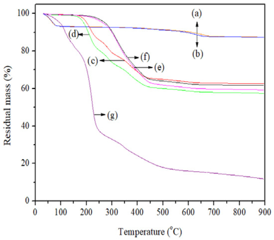 TGA curves of the Mt nanosystems and the extract studied: (a) natural montmorillonite (NMt), (b) natural montmorillonite containing Jamaica flower extract (NMt + JFE), (c) montmorillonite modified with dimethyl benzylhydrogenated tallow ammonium (MtMB), (d) montmorillonite modified with dimethyl benzylhydrogenated tallow ammonium containing Jamaica flower extract (MtMB + JFE), (e) montmorillonite modified with dimethyl dihydrogenated tallow ammonium (MtMD), (f) montmorillonite modified with dimethyl dihydrogenated tallow ammonium containing Jamaica flower extract (MtMD + JFE) and (g) Jamaica flower extract (JFE).