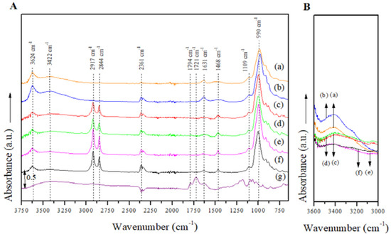 (A) FTIR spectra of the Mt nanosystems and the extract studied in the entire absorption range: (a) natural montmorillonite (NMt), (b) montmorillonite modified with dimethyl benzylhydrogenated tallow ammonium (MtMB), (c) montmorillonite modified with dimethyl dihydrogenated tallow ammonium (MtMD), (d) natural montmorillonite containing Jamaica flower extract (NMt + JFE), (e) montmorillonite modified with dimethyl benzylhydrogenated tallow ammonium containing Jamaica flower extract (MtMB + JFE), (f) montmorillonite modified with dimethyl dihydrogenated tallow ammonium containing Jamaica flower extract (MtMD + JFE) and (g) Jamaica flower extract (JFE). (B) FTIR spectra in the absorption range corresponding to C-O groups (OH stretching) of the Mt nanosystems and the extract evaluated: (a) NMt, (b) MtMB, (c) MtMD, (d) NMt + JFE, (e) MtMB + JFE and (f) MtMD + JFE.