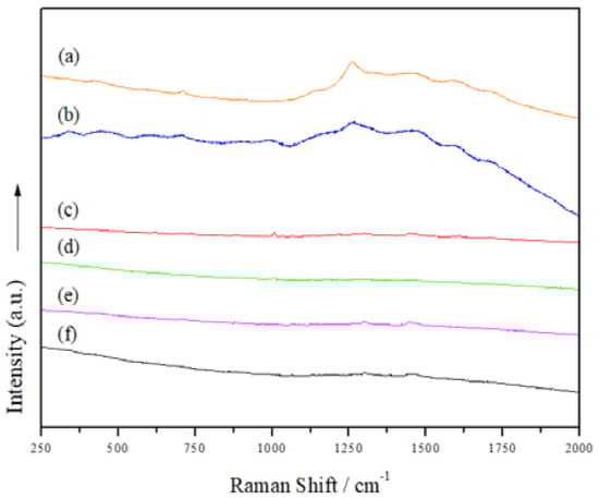 Raman spectra of the different Mt nanosystems studied: (a) natural montmorillonite (NMt), (b) natural montmorillonite containing Jamaica flower extract (NMt + JFE), (c) montmorillonite modified with dimethyl benzylhydrogenated tallow ammonium (MtMB), (d) montmorillonite modified with dimethyl benzylhydrogenated tallow ammonium containing Jamaica flower extract (MtMB + JFE), (e) montmorillonite modified with dimethyl dihydrogenated tallow ammonium (MtMD) and (f) montmorillonite modified with dimethyl dihydrogenated tallow ammonium containing Jamaica flower extract (MtMD + JFE).