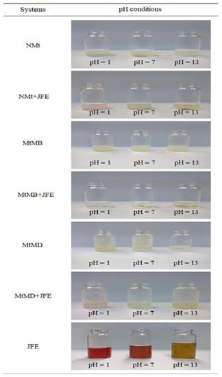 The images of the color variations in the Mt nanosystems under different pH conditions (Figure 7) revealed that the JFE-containing Mts (NMt + JFE, MtMB + JFE and MtMD + JFE) showed a bathochromic effect, i.e., they changed color depending on the pH. These Mt nanosystems had a pink coloration at pH = 1, which was provoked by the formation of the flavylium cation (also called 2-phenyl-benzopyrylium, and consists of two aromatic groups: a benzopyrilium and a phenolic ring) or the oxonium ion, which are the most stable polymeric anthocyanin structures. At pH = 13, however, the JFE-containing Mt nanosystems showed a yellow coloration, possibly because of the quinoidal structure of the polymeric anthocyanins that formed at pH > 8 [48]. Our research group previously developed pH-sensitive nano-clays by incorporating polymeric anthocyanins extracted from blueberries. However, the color changes observed were different from those of the current study [23]. Color changes due to pH were produced by hydroxyl groups of the phenolic rings, and by the benzopirilium [49,50]. This suggests that the flavonoid structures of polymeric anthocyanins differ, depending on the plant source. It is worth noting that at least 20 different polymeric anthocyanin structures are known, and it is estimated that there may be as many as 150 [51]. The bathochromic or pH-sensitive effect observed in the JFE-containing Mt nanosystems is very interesting for the development of composite materials aimed at manufacturing pH-sensitive (“intelligent”) food nanopackaging, or as nanosensors for theragnostic devices.