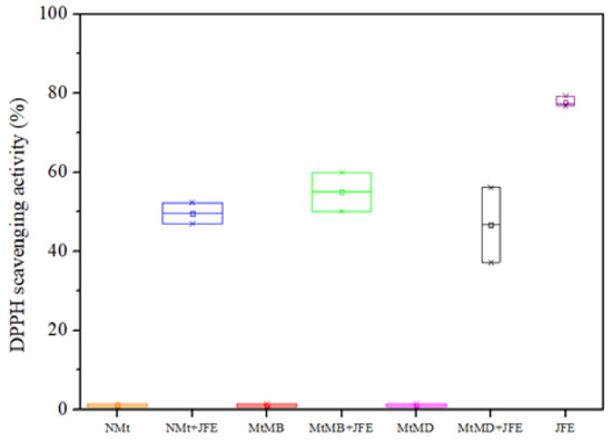 DPPH• cavenging activity of the Mt nanosystems and the extract evaluated: natural montmorillonite (NMt), natural montmorillonite containing Jamaica flower extract (NMt + JFE), montmorillonite modified with dimethyl benzylhydrogenated tallow ammonium (MtMB), montmorillonite modified with dimethyl benzylhydrogenated tallow ammonium containing Jamaica flower extract (MtMB + JFE), montmorillonite modified with dimethyl dihydrogenated tallow ammonium (MtMD), montmorillonite modified with dimethyl dihydrogenated tallow ammonium containing Jamaica flower extract (MtMD + JFE) and Jamaica flower extract (JFE).