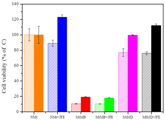 Cell viability of the different Mt nanosystems evaluated at two different doses (dose 0.25% w/v—segmented boxes; dose 0.5% w/v—solid boxes). Mt nanosystems: natural montmorillonite (NMt), natural montmorillonite containing Jamaica flower extract (NMt + JFE), montmorillonite modified with dimethyl benzylhydrogenated tallow ammonium (MtMB), montmorillonite modified with dimethyl benzylhydrogenated tallow ammonium containing Jamaica flower extract (MtMB + JFE), montmorillonite modified with dimethyl dihydrogenated tallow ammonium (MtMD) and montmorillonite modified with dimethyl dihydrogenated tallow ammonium containing Jamaica flower extract (MtMD + JFE).