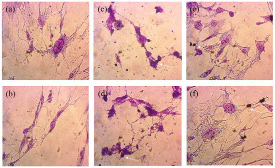 Optical micrographs (at 50× of magnification) of the morphology of cells exposed to the different Mt nanosystems studied: (a) natural montmorillonite (NMt), (b) natural montmorillonite containing Jamaica flower extract (NMt + JFE), (c) montmorillonite modified with dimethyl benzylhydrogenated tallow ammonium (MtMB), (d) montmorillonite modified with dimethyl benzylhydrogenated tallow ammonium containing Jamaica flower extract (MtMB + JFE), (e) montmorillonite modified with dimethyl dihydrogenated tallow ammonium (MtMD) and (f) montmorillonite modified with dimethyl dihydrogenated tallow ammonium containing Jamaica flower extract (MtMD + JFE). The arrows denote cell death of normal human lung fibroblast cells as an example. Many other similar dead cells can be seen from the same field of view in each image.