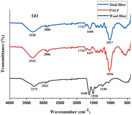 Figure 3a displays the FTIR spectra of sisal, PALF, and wool fibre. The sharp peak for wool fibre, seen at 1640 cm−1, is due to the amide I group present in the wool protein, while the peak at 3272 cm−1 denotes the amide N-H stretching vibration. The bending vibration of the C-N-H bond corresponds to the peaks at 1520 cm−1 [,,]. The FTIR spectra shows similar peaks for both the PALF and sisal, as theyare lignocellulosic fibres. In case of the sisal fibre and PALF, the broad peak at 3332 cm−1 corresponds to the -OH stretching vibrations from cellulose while the symmetric and asymmetric stretching of the CH2 groups is indicated by the peak at 2886 cm−1 []. The peaks at 1732 cm−1 can be attributed to the stretching vibration of C=O groups in hemicellulose and the peaks in between 1627–1606 cm−1,indicate the aromatic C=C stretching vibrations in lignin [,]. It can also be observed that the intensity of the peak at 1606 cm−1 is higher for the sisal fibre, compared to PALF, indicating that the lignin content is higher for the sisal. The C-O/ C-C group stretching is indicated by the peaks at 1017 cm−1 [].