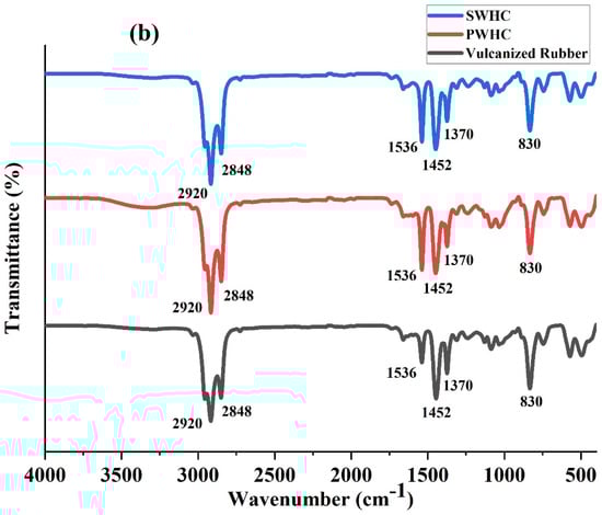 It can be clearly observed, from the Figure 3b, that the SWHC, PWHC, and the vulcanized rubber shows almost the same peaks. The peaks observed at 2920 cm−1 and 2848 cm−1 indicate the symmetrical stretching of the -CH3 bonds and -CH2- bonds, respectively. The characteristic in-plane bending of the amide II group in the wool protein is denoted by the peak at 1536 cm−1. The sharp peaks observed at 1452 cm−1 and 1370 cm−1 indicate the deformation of the -CH3 bonds, while the out of plane bending for the C=C-H group is shown by the peak at 830 cm−1 []. All of these peaks are characteristic of the vulcanized rubber sample. It is observed from the spectra that the peaks corresponding to the wool, PALF, and sisal are not prominent and are masked by the natural rubber. No shifts in the peaks, even after the addition of the fibres, indicates that there is no chemical interaction between the fibres and the polymer matrix, leading to the conclusion that the interaction may be physical, involving van der Waals forces or hydrogen bonds.