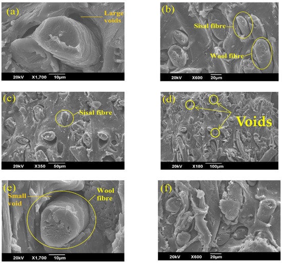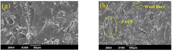 Figure 4a–d shows the cross-sectional scanning electron microscopic images of the SWHC and Figure 4e–h shows that of the PWHC. It is visible from the images that in both the composites, a good network of fibres is present throughout the polymer matrix. It can also be seen from the images that the wool fibre (with scales) is distributed evenly with the sisal fibre (without scales) in the SWHC and with PALF (without scales) in the PWHC. Most of the fibres are in a uniform direction inside the rubber matrix. The absence of large voids in the composites indicates that the hybrid composites are properly prepared without the entrapment of air inside them. However; while comparing the SEM images (Figure 4d,h), which is of the cross sectional images of the SWHC and PWHC, respectively, it is found that the number of voids are comparatively higher in the SWHC than in the PWHC. This indicates a good adhesion between the PALF and NR matrix. The fibre pull-out is visible from the matrix in Figure 4b,f, and the images suggest that in the PWHC (Figure 4h), the voids formed at the root of the pulled-out fibres, are relatively small when compared to that in the SWHC. The higher interfacial adhesion between the natural fibres and the polymer matrix keeps the fibres intact with the matrix, which can also be the reason for the higher tensile strength, shown by the PWHC (11.14 MPa), compared to the SWHC (6.09 MPa) []. It has been reported that the formation of large voids is an indication of the poor interfacial adhesion between the fibres and the matrix [].It is inferred from the SEM analysis that the failure mechanism in these composites was the fibre pull-out, the fibre fracture, and the interfacial debonding.