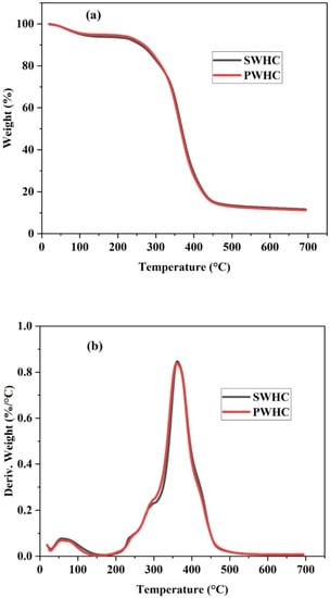 Figure 5a shows the TG curve of the SWHC and PWHC. Due to the similarity in the chemical nature and composition, both composites followed almost the same pattern. As discussed regarding the physical properties of the composites, the composites have a moisture content of 6–7%. The minor weight loss at 110 °C, may be due to the removal of moisture from the composites. The TGA shows a major weight reduction between 250 °C and 400 °C and both composites showed a weight loss of 84.14%, until a constant weight was reached at a temperature of 442.5 °C.