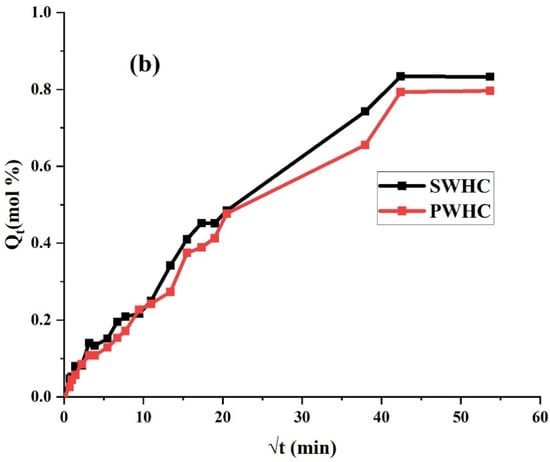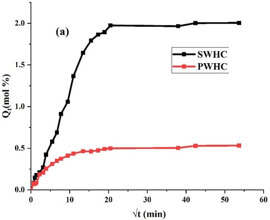 The uptake of toluene and water by the SWHC and PWHC, via the diffusion, was analyzed and plotted between Qt (mole% uptake of solvent) and √t (min). The process of diffusion is a parameter for the kinetics and is related to the nature of the polymer, the nature of the fillers added, its free volume, the extent of crosslinking, etc. []. It is apparent from Figure 6a that the rate of diffusion and the quantity of the toluene absorption is higher in the SWHC, in comparison with the PWHC. The low absorption and diffusion of toluene in the PHWC may be due to the dense packing of PALF inside the rubber matrix, which restrict the diffusion of the aromatic solvent []. This is also supported by the SEM images, which showed a higher packing density, a better adhesion, and less void contents in the PWHC than the SWHC. At the time of saturation, the SWHC showed a weight gain of 184.65%, while it was 95.85% for the PWHC.