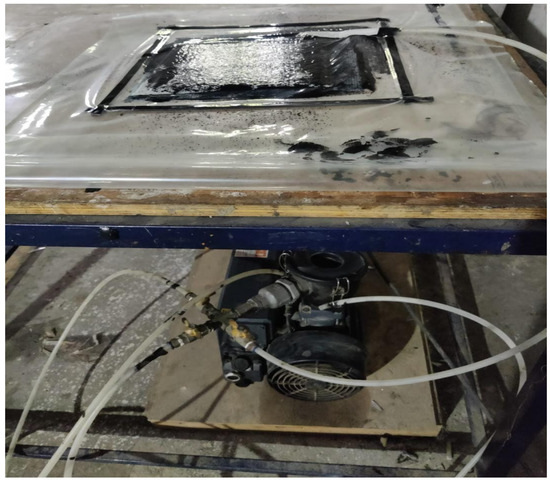 The current study employed the vacuum infusion process to fabricate composite laminate. Manufacturing high-strength composite parts comparable to composite laminates created from prepreg, the autoclave process, and so on is cost-effective. In most cases, the vacuum infusion process is carried out in a closed system. A perforated film is placed in the vacuum bag during this process; dry fibre and release film are placed on top of the mould surface and sealed inside the vacuum bag [41]. Vacuum bag setup was constructed in house. Figure 2 illustrates how the vacuum force moves resin down a symmetry line from the resin container into the vacuum bag. The presence of more fibre causes the impregnation time to be delayed.