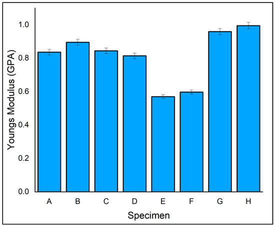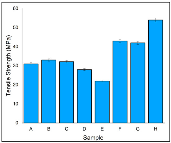 Figure 6 depicts the tensile modulus relation of eight different fabricated laminates. The error bar is plotted along in the bar chart plotted for the tensile modulus. These error bars were obtained by taking three tests continuously for the same laminate material. Among all eight laminates, the highest tensile modulus of 0.98 GPa was exhibited by laminate H, which had an outer layer of ramie fibre and core of flax fibre due to good bonding of matrix and reinforcement by vacuum infusion process. Laminate G showed the second-highest tensile modulus of 0.96 GPa, which had an outer layer of flax fibre and ramie fibre as core due to good bonding of matrix and reinforcement by vacuum infusion process. The trend was similar to the result obtained for tensile strength. This reveals that the stacking sequence of the reinforcements plays a vital role in their properties [45]. It is inferred that sandwiching three consecutive layers of the same fibres potentially increases the tensile moduli of the laminates.