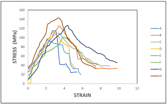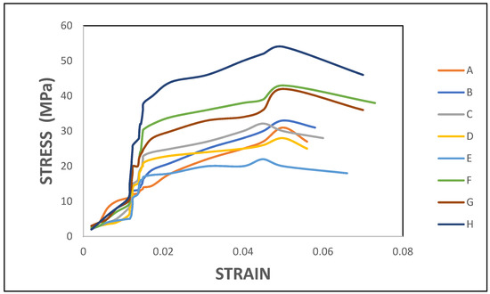Figure 5 depicts the stress vs. strain relation of eight different fabricated laminates. The graph was plotted from the result obtained during the tensile test. It is shown that all the eight laminates have a sudden raise in the stress value when the strain was around 0.013. Until this point, the stress varied at different rates respective to the composition and stacking sequences of the laminates. It is inferred that the stacked layers of the reinforcement materials offered resistance against the external load. Laminate B maintained an almost constant stress of 20 MPa for the majority of the strain. However, this laminate attained a maximum stress of 23 MPa at the 0.044 strain. Compared among the eight laminates, this was the lowest. It is inferred that the five layers of ramie fibres were able to absorb relatively less load causing it to exhibit minimal stress. However, the strain value was considerably greater than in laminates such as A, C, D, and E.