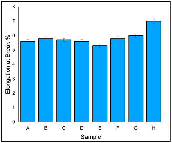 Figure 7 depicts the elongation relation of eight different fabricated laminates. All the composites had more than 5% elongation. This reveals the ductile behaviour of the laminates. Among all eight laminates, the highest elongation of 7.1% was exhibited by laminate H, which had an outer layer of ramie fibre and core of flax fibre due to good bonding of matrix and reinforcement by vacuum infusion process. The hybrid laminates D and F, which had an outer and alternate layer of ramie fibre, exhibited elongation of 1.6% and 1.8% lower than laminate H, respectively. This shows that the influence of fabrication technique also plays a pivotal role in hybrid composites. It is concluded that reinforcement and hybridization have a positive impact on elongation properties.