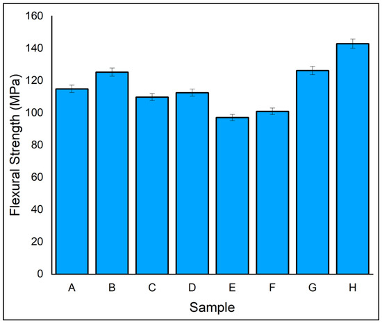 The material flexibility plays a critical role in resisting the loads when it acts perpendicular to the laminate plane. The flexural behaviour of the fabricated laminates is brittle, as is the tensile behaviour. In the present study, a three-point flexural analysis was used to find the flexural strength of laminates and the results are compared in Figure 8. A maximum flexural strength of 143 MPa was obtained for laminate H and a minimum flexural strength of 97.15 MPa for laminate E. The flexural strength of laminate B, which had all five layers of ramie fibre, was 125.3 MPa, which was 8.26% more than its counterpart laminate A. The results show that the flexural strength of the hybrid laminates was maximum when the laminate had ramie as the outer layer rather than flax. Furthermore, it is inferred that the hybridization of ramie with flax fibre had significantly enhanced the flexural properties of the laminates due to fibre hybridization. The sequence of fibres influenced the flexural characteristics of the composite. As ramie has good flexural strength, the same was reflected in ramie as shell and flax as the core laminate [46,47]. Similarly, ramie and flax placed as alternative layers resulted in better flexural strength than other laminates. When flexural loads are applied to a composite specimen, the fibres at the external position are highly stressed [48]. Proper penetration of resin into fibre in flexural strength is highly dependent on adhesive properties of fibre and matrix [49]. It has additionally been stated that the hybridization of natural fibre provides better flexural strength than single fibres [50].