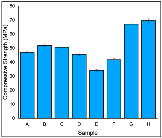 The matrix material has an important influence on the compressive strength of laminates. The length of the compressive test specimen is designed to eliminate global buckling and to develop pure compressive stress at the gauge section. In Figure 10, the compressive strength of laminate H with ramie as the outer layer and flax as the core is 69.65 MPa, the highest among the fabricated laminates. On the other hand, the compressive strength of laminate E with alternate layers of flax and ramie is 34.20 MPa, the lowest of the eight laminates. At the outset, the ability of the hybrid laminates to absorb the compressive force improved. Laminate B, having all five layers of ramie fibre, had 51.95 MPa, which was a 9.86% higher compressive strength than its counterpart, which had all five layers of flax fibres. A good fibre resistance to breakout is exhibited when ramie is placed as the outer layer [51]. The compressive strength plotted for the eight laminates showed a trend similar to that of the tensile test. It is inferred that the compressive behaviour of the laminates matched with the tensile test.