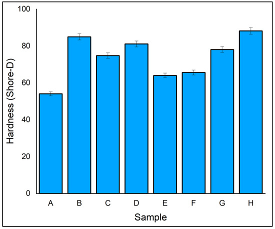 The hardness of a material is its capacity to withstand persistent deformation. Shore D hardness values were used to test the hardness of the fabricated laminates. The results are shown in Figure 12. Laminate A, which contained all five layers of flax, had a lower hardness value of 54 due to the low mechanical strength of flax fibre compared to ramie fibre. Laminate H showed the highest hardness value of 88.20 due to the presence and the strong bonding of ramie with flax fibre. Hybrid laminates C, D, E, F, G, and H showed higher hardness than laminate A. The results revealed that the incorporation of ramie fibre improved the hardness of the hybrid composite. Laminate H showed 27.40% higher hardness than laminate E, which may be due to the stacking of ramie and flax fibres. It is concluded that the laminates that have ramie fibre as skin material resist extra aberrations and penetration compared to laminates composed of flax fibre [57,58]. The increased stiffness of the flax and ramie fibres, in addition to the better interaction between the reinforcement fibres and phenol formaldehyde matrix, provide a high resistance to indentation by the indenter.