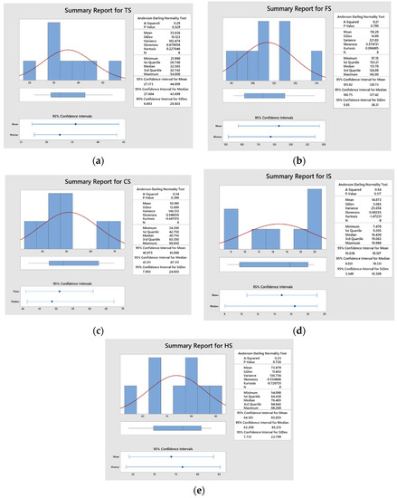 Table 3 shows the experimental result of the composites. Figure 13 shows the statistical analysis of responses tensile, flexural, compressive, impact strength and hardness values obtained from Minitab 19 software (Minitab, LLC, USA) as presented below. It is observed that all the p-values are greater than 0.05, which shows that the measured experimental values were normally distributed.