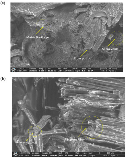 The flexural test provided a detailed examination of the failure zone of laminate E. The flexural test reveals that the eventual failure was due to matrix cracking. The SEM from the flexural test specimen showed that matrix material continued to hold the reinforcement fibres. However, the matrix was pulled to its breaking point before undergoing brittle fracture [61]. Figure 14b clearly states that voids were found to be minimum due to the uniform load applied to the specimen.