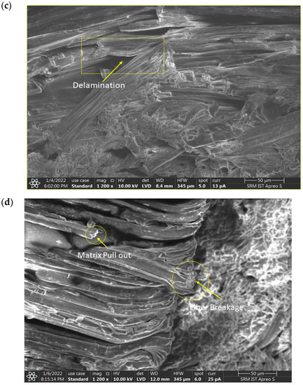 Figure 14d shows a morphological analysis of laminate B. The failure occurred due to a sudden impact load, resulting in fibre pull-out, matrix failure, and fibre breakage. Although the matrix had fragmented under the impact force, the fibres remained intact. These defects formed as the result of sudden application of the load during the impact test [62].