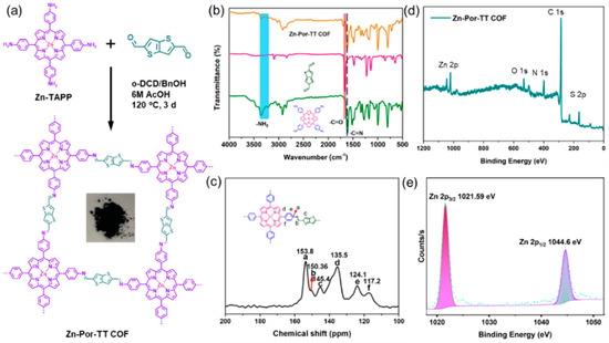 (a) Synthetic diagram of Zn-Por-TT COF; (b) FT-IR spectra of Zn-Por-TT COF (orange), TT (pink), Zn-TAPP (green); (c) 13C CP-MAS NMR spectrum of Zn-Por-TT COF; (d) XPS of Zn-Por-TT-COF; and (e) high-resolution XPS spectrum of Zn.