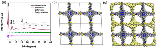 The crystalline structure of the Zn-Por-TT COF was assessed by a powder X-ray diffraction measurement (PXRD) combined with the theoretical simulation (Figure 2a). There are at least six prominent diffraction peaks in the PXRD pattern, indicating the high crystallinity of Zn-Por-TT COF. The diffraction peaks appeared at 3.3°, 6.6°, 7.2°, 9.8°, 10.7°, and 22.2°, which can be assigned to (100), (200), (210), (300), (310), and (001) facts, respectively. The crystalline architecture of the Zn-Por-TT COF matched well with the simulated AA stacking model which provided a unit cell parameter of a = 27.23 Å, b = 27.34 Å, c = 4.29 Å, α = 76.3°, β = 100.9°, and γ = 95.8°. The calculated PXRD profile corresponds well to the experimental data and the deviations of the Pawley refinement are Rp = 2.76% and Rwp = 4.29%.