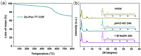 (a) TGA profile of Zn-Por-TT COF in N2; (b) PXRD patterns of Zn-Por-TT COFs before (dark yellow) and after treatments in the solution of HCl (pH = 2, cyan) and NaOH (1 M, violet).