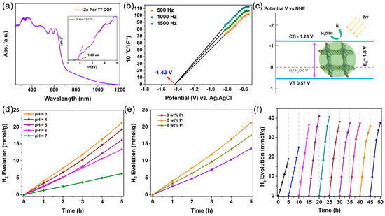(a) UV-Vis DRS spectrum of Zn-Por-TT COF, insert: (ahυ)2 versus hυ curve of Zn-Por-TT COF; (b) Mott–Schottky (M-S) plots of Zn-Por-TT COF at 500 Hz, 1000 Hz, 1500 Hz; (c) the CB and VB positions of Zn-Por-TT COF; (d) H2 evolution rate of Zn-Por-TT COF under different acidity; (e) H2 evolution rate of Zn-Por-TT COF with different Pt loading amounts; (f) time course of H2 productions under visible light (λ > 400 nm) irradiation of Zn-Por-TT COF.