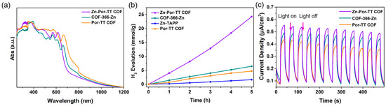 (a) DRS-UV spectra of Zn-Por-TT COF (violet), COF-366-Zn (cyan), and Por-TT COF (orange); (b) H2 evolution rates of Zn-Por-TT COF (violet), COF-366-Zn (cyan), and Por-TT COF (orange); (c) photocurrent-time plots of Zn-Por-TT COF (violet), COF-366-Zn (cyan), and Por-TT COF (orange).