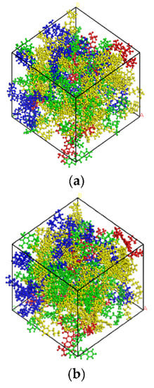 The established asphalt model is optimized for 100,000 steps in the COMPASS force field to minimize the energy of the system and obtain the most stable structure of the asphalt. In order to release the energy generated in the formation and optimization of the model, use the “anneal” option in the Forcite module to anneal the model; the annealing temperature is 300 K~500 K, the ensemble uses NVT, and the number of steps is 25,000. The asphalt model, before and after optimization, is shown in Figure 2.