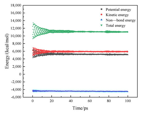 Microscopically, the adhesive performance between interfaces is evaluated by the adhesion work, and the adhesion work is defined as the energy required to separate the asphalt from the SBS. The specific method is shown in Formula (4). The adhesion work between asphalt and SBS is mainly composed of non-bond energy, which includes van der Waals force and the Coulomb electrostatic force. The van der Waals force and the Coulomb electrostatic force between SBS and asphalt can be calculated after dynamic simulation, and the total adhesion work can be obtained through Formulas (4) and (5). Specific results are shown in Table 6.