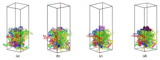 After molecular dynamics simulation of the asphalt–SBS interaction layer. (a) 2/8. (b) 3/7. (c) 4/6. (d) 5/5.