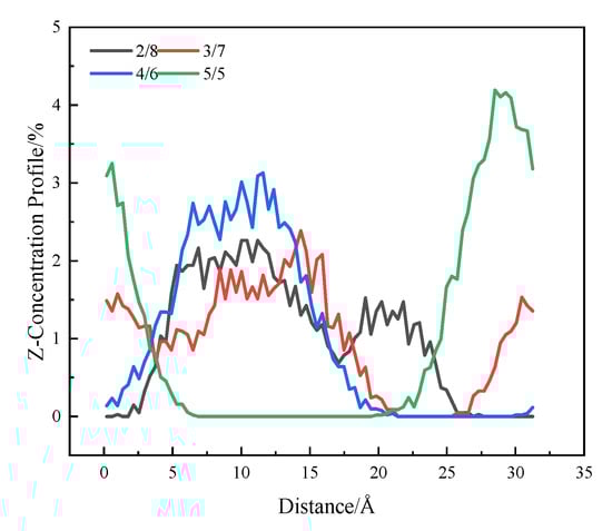 The qualitative analysis of the simulated images cannot fully reflect the interaction between asphalt and SBS during the swelling process. Therefore, this paper quantitatively evaluates the effect of each SBS block ratio on the diffusion effect by analyzing the infiltration concentration profile and the MSD of the two. The infiltration of SBS in asphalt is calculated using the “concentration profile” option in Forcite to calculate the SBS concentration distribution in the Z direction. The results are shown in Figure 9.