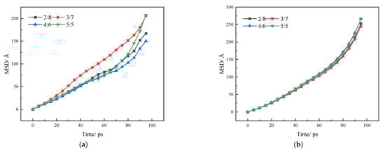 It can be seen from Figure 10a that the diffusion effect of SBS with different block ratios in the first 10 ps was not significantly different. After 10 ps, the influence of block ratio began to play a significant role. The diffusion coefficient of SBS is obtained by fitting and analyzing the mean square displacement curve according to Formula (3). The diffusion coefficients of 2/8, 3/7, 4/6 and 5/5 are 1.65608, 2.06852, 1.44826, and 1.86168 respectively. The diffusion rate in asphalt is ranked from strong to weak, and 3/7 > 5/5 is obtained > 2/8 > 4/6; this result shows that the block SBS has more advantages than the SBS with 3/7 in the process of thermal movement with asphalt.