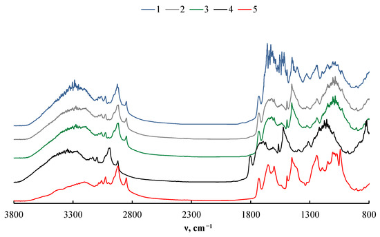 In the infrared spectrum of the obtained copolymer dispersions (Figure 1, curves 1, 2, and 3), absorption bands related to those of collagen (Figure 1, curve 4) and PAA (Figure 1, curve 5) can be observed.