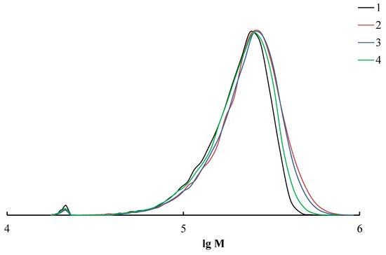 The dispersion contains a highly polymeric product with a molecular weight (MW) slightly higher than that of collagen, as shown by the GPC analysis (Table 2). The molecular weight distribution (MWD) of the obtained copolymers at 25 (Figure 2, curve 2), 45 (Figure 2, curve 3) and 60 °C (Figure 2, curve 4) show a slight shift to higher MWs compared to the original collagen MWD (Figure 2, curve 1). The trend of copolymer MW as a function of the synthesis temperature is consistent with the kinematic viscosity changes found for these samples (Table 2).