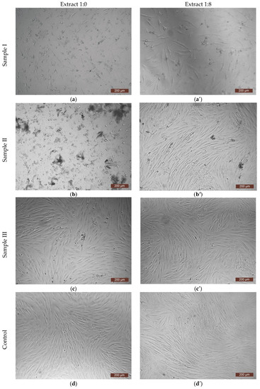 Samples II and III were placed in Petri dishes (60 mm diameter) filled with DMEM/F12 medium containing 1% antibiotics (penicillin-streptomycin 100x, PanEco) and 2% fetal calf serum, and were incubated for 1 day at 37 °C and 5% CO2. After 24 h, complete dissolution of the samples was observed, and the extract obtained was used for the study. Sample I was a suspension (hereafter—“extract”). For the MTT assay, the extracts obtained were diluted and used in the following proportions: Control 0:1: Extract 1:0; with further dilutions 1:1; 1:2; 1:4, and 1:8 of extract: medium, respectively.