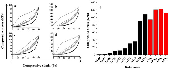 Mechanical properties of GIAs. Cyclic stress–strain curves of GIA0 (a), GIA0.5 (b), GIA1 (c) and GIA2 (d) at the strain of 50% for 5 cycles. Maximum compressive strengths of different aerogels (sponges) at 50% cyclic compression strain (e).
